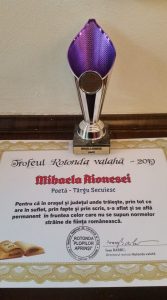 Poeta Mihaela Aionesei din Târgu Secuiesc și-a îmbogățit palmaresul cu un nou premiu. Aceasta a primit recent trofeul „Rotonda Valahă”, în cadrul unui amplu eveniment național: Salonul de Literatură și Artă ” Rotonda Plopilor Aprinși”.
