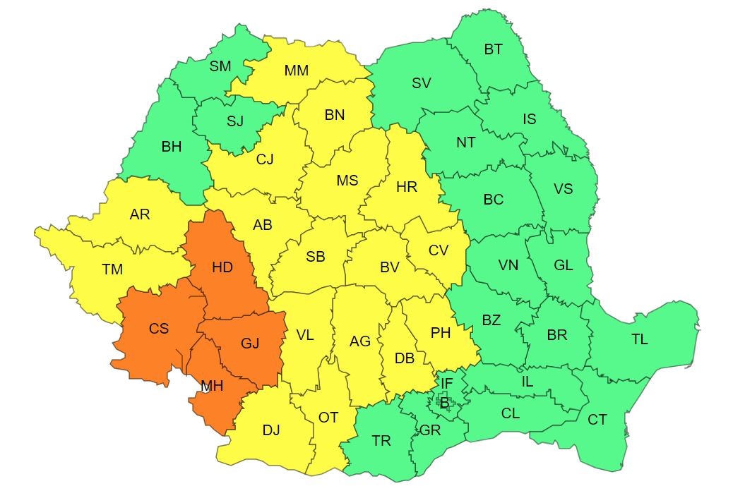 Judeţele avertizate cu Cod portocaliu sunt Caraş-Severin, Hunedoara, Gorj şi Mehedinţi.