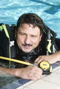 Scafandrul Szabó Jenő, care are o experienţă de aproape trei decenii în acest domeniu, a absolvit Facultatea de Geologie din Cluj, iar în anul 1994 a obţinut brevetul internaţional de instructor, având atestat inclusiv din partea NAUI (SUA), cea mai mare organizaţie din lume pentru training subacvatic.