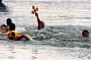 În localităţile aflate lângă cursuri mari de apă, cum ar fi Dunărea ori râuri importante din țara noastră, ca și în aşezările de  la ţărmul mării au loc loc, în această zi importantă, întreceri  aparte  ce atestă  curajul şi rezistenţa la ger a unor bărbaţi ce sar… în apă în plină iarnă,  să recupereze  o cruce emblematică din lemn. După oficierea Slujbei, preotul   însoţit de numeroşi enoriaşi  aruncă cât mai departe  în unde o cruce de dimensiuni ceva mai mari, ce se cere recuperată de temerari.  Dintre cei prezenţi câţiva curajoși  se aruncă de regulă în apă şi înoată rapid ca să prindă crucea şi să o aducă la mal, în aplauzele şi uralele asistenţei. Invingătorul  este felicitat şi se va bucura de  respectul comunităţii locale. În plus, va căpăta  convingerea că  tot anul  o să fie ferit de  boli.