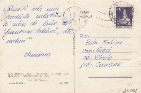 Cartea poștală, donată de prof. dr. Luminița Cornea, a călătorit pe distanța Costinești-Araci, în vara anului 1975, iar fotografia lui Alexandru Florescu redă o panoramă a plajei, din care nu lipsește epava, simbolul stațiunii. Vederea face parte dintr-o serie editată în anii ‘70 de celebra Editură Meridiane și e încadrată în categoria Arta grafică.