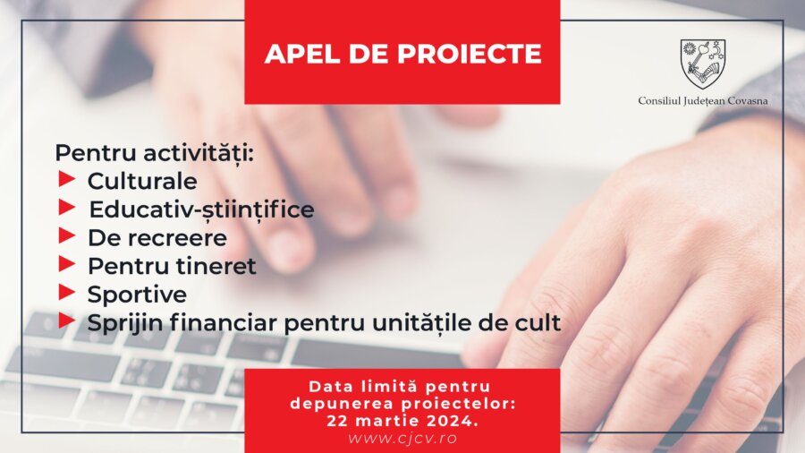 „Criteriile de evaluare a proiectelor depuse pentru acordarea de finanţări nerambursabile pot fi consultate pe site-ul Consiliului Judeţean. Tot pe site-ul instituţiei, este disponibilă şi documentaţia de finanţare şi de decont: cjcv.ro. Cererile de finanţare, însoţite de proiectele culturale, pot fi depuse la registratura Consiliului Judeţean sau trimise prin Poştă până la data de 22 martie 2024 (…) Implementarea acestora trebuie să se facă între 29 aprilie şi 5 decembrie 2024″, se mai arată în comunicat.