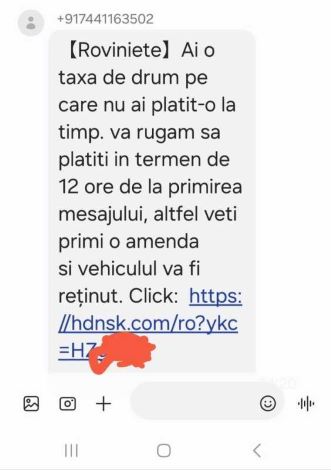 Compania Națională de Administrare a Infrastructurii Rutiere atenționează în legătură cu o posibilă fraudă electronică, în contextul în care în această perioadă circulă mesaje înșelătoare care pretind că sunt trimise în numele „Rovinietei” sau al CNAIR și solicită plata urgentă a unei presupuse „taxe de drum restante”.
