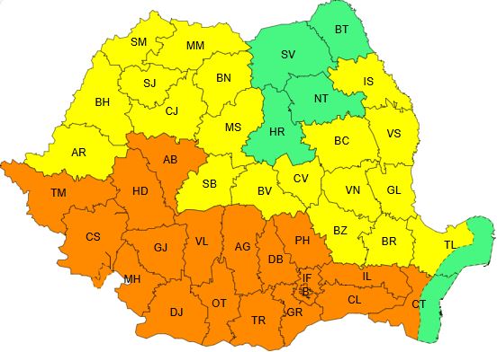 Se vor afla sub Cod portocaliu județele Timiș, Alba, Hunedoara, Caraș-Severin, Vâlcea, Gorj, Mehedinți, Argeș, Olt, Dolj, Dâmbovița, Teleorman, Prahova, Ilfov, Giurgiu, Ialomița, Călărași, și municipiul București, integral, și, parțial, județul Constanța.