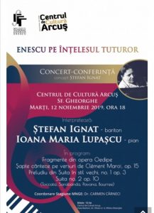 Centrul de Cultură Arcuş și Muzeul Național George Enescu organizează marți, 12 noiembrie 2019, concertul de muzică de cameră „Enescu pe înțelesul tuturor” susţinut de Ioana Maria Lupașcu (pian) și Ștefan Ignat (bariton).