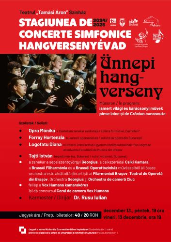 În sala mare a Teatrului „Tamási Áron” din Sfântu Gheorghe va avea loc vineri, 13 decembrie, de la ora 19.00, concertul festiv din cadrul Stagiunii de Concerte Simfonice din Sfântu Gheorghe.