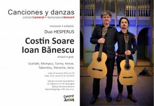 La Centrul de Cultură Arcuș (Casa Bastion, Sf. Gheorghe, str. Oltului nr. 6) va avea loc joi, 27 ianuarie, ora 18, concertul extraordinar de chitară „Canciones y danzas” interpretat de Duo HESPERUS – Costin Soare și Ioan Bănescu din București.