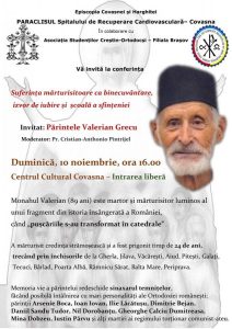 Părintele Valerian Grecu va fi prezent la Covasna, în data de 10 noiembrie, în cadrul conferinței „Suferința mărturisitoare ca binecuvântare, izvor de iubire și școală a sfințeniei”.