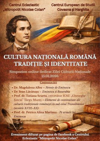 Cu prilejul Zilei Culturii Naționale, Centrul Ecleziastic de Documentare „Mitropolit Nicolae Colan” (CEDMNC) din Sfântu Gheorghe, în colaborare cu Centrul European de Studii Covasna și Harghita, organizează simpozionul online intitulat „Cultura națională română tradiție și identitate. Repere eminesciene”, care va fi difuzat astăzi, 15 ianuarie 2026.