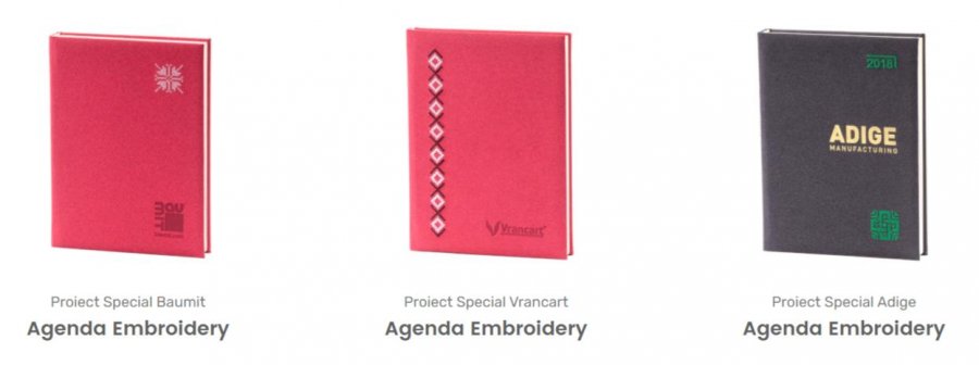 Firmele cu capital romanesc, sau cele care produc sub sloganul “made in Romania” au optiunea legitima de a apela la motive romanesti, si este exemplul firmelor Vrancart, Adige, Holcim si Baumit, care au ales personalizarea agendelor prin broderie. Aceasta metoda de personalizare ofera o nota de unicitate, intrucat nu gasim in fiecare zi agende brodate. Din punct de vedere tactil, suprafata brodata pe aceste agende ofera un la atingere o senzatia puternica si placuta.