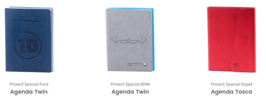 Cand tii in mana o agenda a unui brand din industria auto, in acel moment, nici mai mult nici mai putin, trebuie sa simti ca agenda are motor si ca sub coperta de piele aceasta agenda vibreaza in propriul ritm. Ford, BMW sunt exemple de agende din piele naturala sau PU care transmit foarte bine mesajul. Prin personalizarea cantului se transmite finetea de contur, atentia la detalii iar prin efectele imprimarii pe coperta se pune sigiliul unui eveniment festiv.