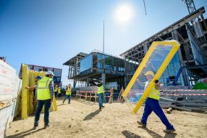 Construcţia terminalului Aeroportului avansează într-un ritm susţinut, iar constructorul înregistrează un avans de peste o lună faţă de graficul de execuţie propus la începutul lucrărilor. În momentul de faţă, clădirea cu trei niveluri este ridicată în totalitate, iar în prezent se lucrează la acoperiş şi la faţadă.