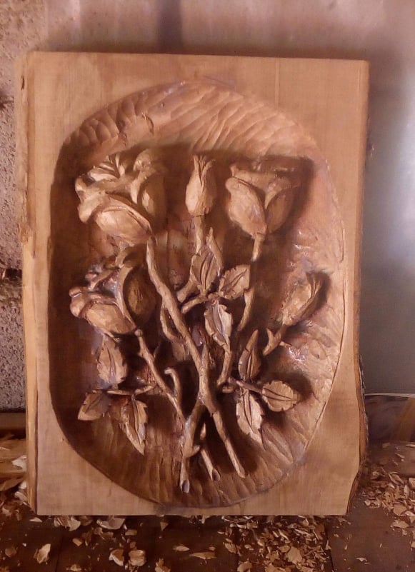 - Îmi place să sculptez în paltin, nuc, stejar. Cel mai mult îmi place paltinul – are culoarea lemnului alb. Și de ce îmi mai place paltinul: după ce termin, când îl dau cu baiț, pot să-i dau altfel culorile. De exemplu, am un tablou cu trandafiri, iar floarea am făcut-o din lemn de esență diferită și le-am lipit. Și au culori diferite.