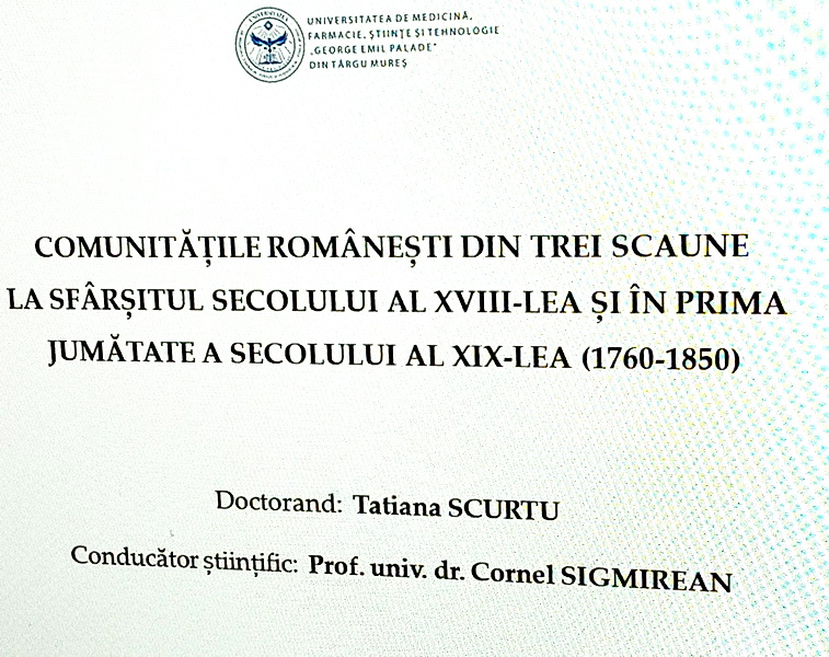 Teza de doctorat intitulată Comunitățile românești din Trei Scaune la sfârșitul secolului al XVIII-lea și în prima jumătate a secolului al XIX-lea (1760-1850), susținută la sfârșitul lunii septembrie a .c., de către Tatiana Scurtu, „își propune să aducă în atenția istoriografiei un spațiu puțin explorat al Transilvaniei, anume sud-estul acesteia, în care raporturile dintre majoritate și minoritate, dinamica economică, particularitățile confesionale și presiunile politice au generat evoluții aparte. Studiul are ca punct de plecare constatarea că istoriografia românească a acordat relativ puțină atenție comunităților românești din această zonă, adesea prezentată unilateral în literatura maghiară drept un spațiu „monoetnic” secuiesc.