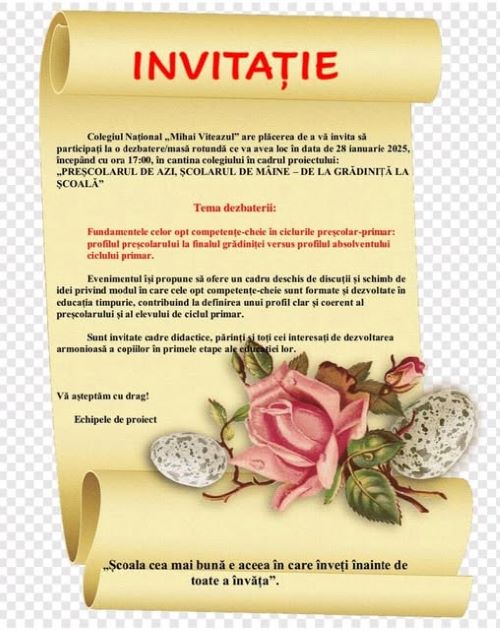 Colegiul Naţional „Mihai Viteazul” din Sfântu Gheorghe, echipele de proiect alcătuite din profesorii pentru învățământ primar și profesorii pentru educație timpurie invită cadrele didactice, părinții și persoanele interesate la o dezbatere/masă rotundă cu tema „Fundamentele celor opt competențe -cheie în ciclurile preșcolar-primar, profilul preșcolarului la finalul grădiniței versus profilul absolventului ciclului primar”, activitate cuprinsă în calendarul parteneriatului educațional „PREŞCOLARUL DE AZI, ŞCOLARUL DE MÂINE- DE LA GRĂDINIȚĂ LA ȘCOALĂ”.