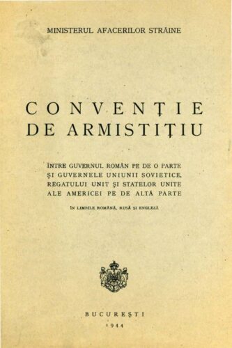 În primul articol al Convenţiei de armistiţiu se arăta: ”Cu începere de la 24 august 1944, ora 4 a.m., România a încetat cu totul operaţiunile militare împotriva Uniunii Republicilor Sovietice Socialiste, pe toate teatrele de război, a ieşit din războiul împotriva Naţiunilor Unite, a rupt relaţiile cu Germania şi sateliţii săi, a intrat în război şi va duce războiul alături de Puterile Aliate împotriva Germaniei şi Ungariei, cu scopul de a restaura independenţa şi suveranitatea României, pentru care scop va pune la dispoziţie nu mai puţin de 12 divizii ale infanteriei, împreună cu serviciile tehnice auxiliare. Operaţiunile militare din partea forţelor armate române cuprinzând forţele navale şi aeriene, împotriva Germaniei şi Ungariei, vor fi purtate sub conducerea generală a Înaltului Comandament Aliat (sovietic)”, conform volumului ”Relaţii internaţionale în acte şi documente”, volumul II (1939-1945) (Ed. Didactică şi Pedagogică, Bucureşti, 1976).