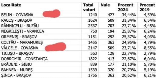 „În unele dintre localităţi creşterea procentuală de buletine nule faţă de 2019 este de aproape şapte ori (Belin, Racoş). Cu toate acestea, există creştere de 20 de ori (Poronina Mare – Mehedinţi), 12 ori (Vărşag – Harghita, Lelese – Harghita sau Ghidici – Dolj) sau de nouă ori (Topalu – Constanţa sau Perişor – Dolj). Cel mai probabil este o creştere care nu poate fi pusă doar pe seama greşelilor făcute de alegători”, mai susţine Expert Forum.