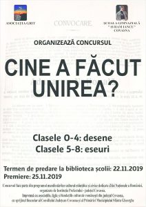 Elevii de la Școala Gimnazială „Avram Iancu” din Covasna sunt invitați să participe la concursul intitulat „Cine a făcut Unirea?”, înscriindu-se cu desene sau compuneri pe această temă.
