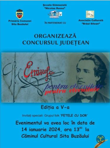 La Căminul Cultural din Sita Buzăului are loc duminică, 14 ianuarie a.c., de la ora 13.00, a V-a ediție a proiectului educațional județean „Eminescu pentru eternitate- concurs de recitare, creație literară și plastică„, organizat de Școala Gimnazială „Nicolae Russu” din localitate, în parteneriat cu Inspectoratul Școlar Județean Covasna, Asociația Culturală „Brâul Sitean” și Primăria comunei Sita Buzăului.