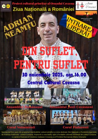 „Și vom da mână cu mână, cei cu inima română! Vă așteptăm să petrecem împreună duminică, 30 noiembrie 2025, la Centrul Cultural Covasna. Intrarea este liberă! se arată pe pagina de socilaizare a Asociației Culturale „Junii Covasnei”.