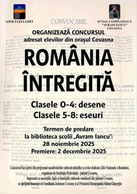 Programul dedicat Zilei Naționale a României a debutat cu concurs de creație „România Întregită” organizat de Asociația „GRIT” din Covasna, care se adresează elevilor din clasele primare și gimnaziale. Aceștia sunt așteptați să trimită desene sau câte un eseu cu tema „România Întregită”, până la data de 30 noiembrie a.c.