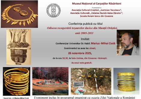 Vineri, 28 noiembrie, în Sala Unirea din Voinești-Covasnava avea loc, începând cu ora 18.30, conferința cu titlul ,,Odiseea recuperării tezaurelor dacice din Munții Orăștiei, anii 2005-2011”.
