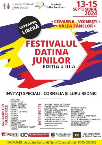Valea Zânelor din Voinești – Covasna se va îmbrăca în haine de sărbătoare și va răsuna de cântecele și dansurile populare românești care vor fi prezentate de cei aproape 500 de artiști tineri sau consacrați din țară dar și din Republica Moldova, care vor participa la a III-a ediție a Festivalului „DATINA JUNILOR” organizat de Asociația Culturală „Junii Covăsneni” împreună cu Asociația „ Suflet Românesc” din Târgu Secuiesc, în perioada 13-15 septembrie a.c.