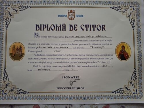 Printre cei care au primit Diplomă de Ctitor, la loc de cinste, s-a aflat și familia Sorin și Mărioara Lăcătușu, acordată de PS Ignatie, Episcopul Hușilor, pentru „rodnica lor activitate pusă în slujba Bisericii și a societății, precum și pentru implicarea generoasă în ctitorirea Bisericii cu hramul „Sfântul Ierarh Nectarie de la Eghina”, din parohia Tatomirești, județul Vaslui. Nădăjduind că această cinstire va fi un temei de a lucra și pe mai departe, cu încă și mai multă râvnă, le urăm, împreună cu Sfântul Apostol Ioan, să aibă spor în toate și să meargă bine cu sănătatea, precum merg bine cu sufletul (3 Ioan I.2.). Dată în reședința noastră eparhială din Huși, în anul mântuirii 2024, Luna noiembrie ziua 09, †Ignatie, Episcopul Hușilor…