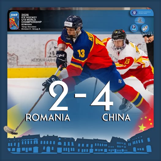 Selecționata masculină a României a fost învinsă de echipa Chinei cu scorul de 4-2 (0-1, 1-1, 3-0), joi seara, la Campionatul Mondial de hochei pe gheață Under-18, Divizia a II-a, Grupa A, pe Patinoarul „Deme Laszlo” din Târgu Secuiesc.România a condus cu 1-0, prin golul lui Tudor Bolocan (07:58), și cu 2-1, grație golului reușit de Vidor Albert (32:24), dar China s-a impus după o ultimă repriză foarte bună.