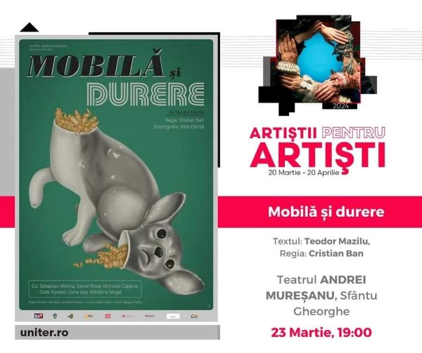 Teatrul „Andrei Mureşanu” (TAM) din Sfântu Gheorghe joacă astăzi, 23 martie, spectacolul „Mobilă şi durere” de Teodor Mazilu, în regia lui Cristian Ban, iar încasările vor fi donate programului „Artiştii pentru artişti”, iniţiat de UNITER.