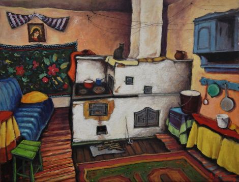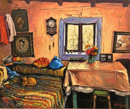 D.C.: Am mai dezvoltat acest subiect într-una din cele două cărți pe care le-am scris, însă pentru cititorii publicației de față, voi relua povestea pe scurt. Așadar, întorcându-mă în copilărie, mi-aduc aminte că primul impuls spre a desena a fost acela când, copil fiind, mergând deja spre șase ani, într-o iarnă năpraznică, un om din sat a venit pe la noi cu treabă. După ce a stat de vorbă cu tata, ne-a întrebat pe mine și pe una dintre surori, dacă suntem cuminți, dacă ascultăm de părinți și mai ales dacă nu coborâm de pe cuptorul cald pe dușumeaua rece din lut galben acoperită ici colo cu câte un țolișor (covoraș) țărănesc țesut de bunica la stative. Mama, dar și bunica, nu ne lăsau pe jos fiindcă era frig și răceam foarte ușor, de aceea trebuia, cât era ziua de lungă, să stăm acolo, sus pe cuptor, unde nu prea aveam ce face, decât să privim pe fereastră cum cad fulgii de nea. Îmi plăcea această cădere necontenită a zăpezii, nu știu de ce și nici nu mă întrebam…