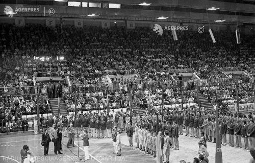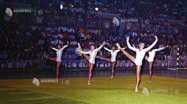 Foto: (c) AGERPRES FOTO/ARHIVA – Ceremonia de decorare a sportivilor români, participanţi la Olimpiada de la Montreal (Quebec, Canada), desfăşurată în perioada 17 iulie – 1 august 1976; demonstraţie sportivă a echipei feminine de gimnastică artistică.