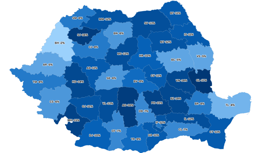 Județele mai puțin afectate ar fi: Bihor (2%), Tulcea (4%), Arad (5%), Bacău (5%), Vaslui (5%).