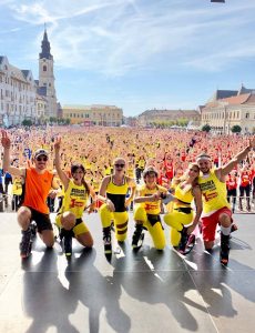 Cele peste 1500 de persoane au urcat pe ghetele rebound pentru recuperare medicală, specifice Kangoo Jumps, și au făcut mișcare, neîntrerupt, timp de 30 de minute, pe muzică antrenantă, în Piața Unirii din Oradea, ghidați de pe scenă de Kinga Sebestyen. Mulți dintre aceștia au făcut Kangoo Jumps pentru prima dată.