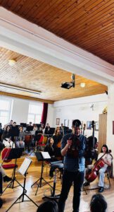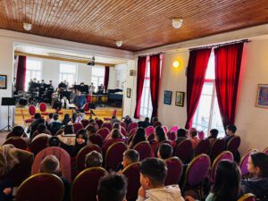 Pe parcursul întâlnirii, profesorul și dirijorul Lofi Gellért le-a prezentat elevilor de la Școala Gimnazială „Nicolae Colan”, Sfântu Gheorghe, instrumentele, le-a vorbit despre rolul fiecăruia în ansamblu și despre responsabilitatea dirijorului.