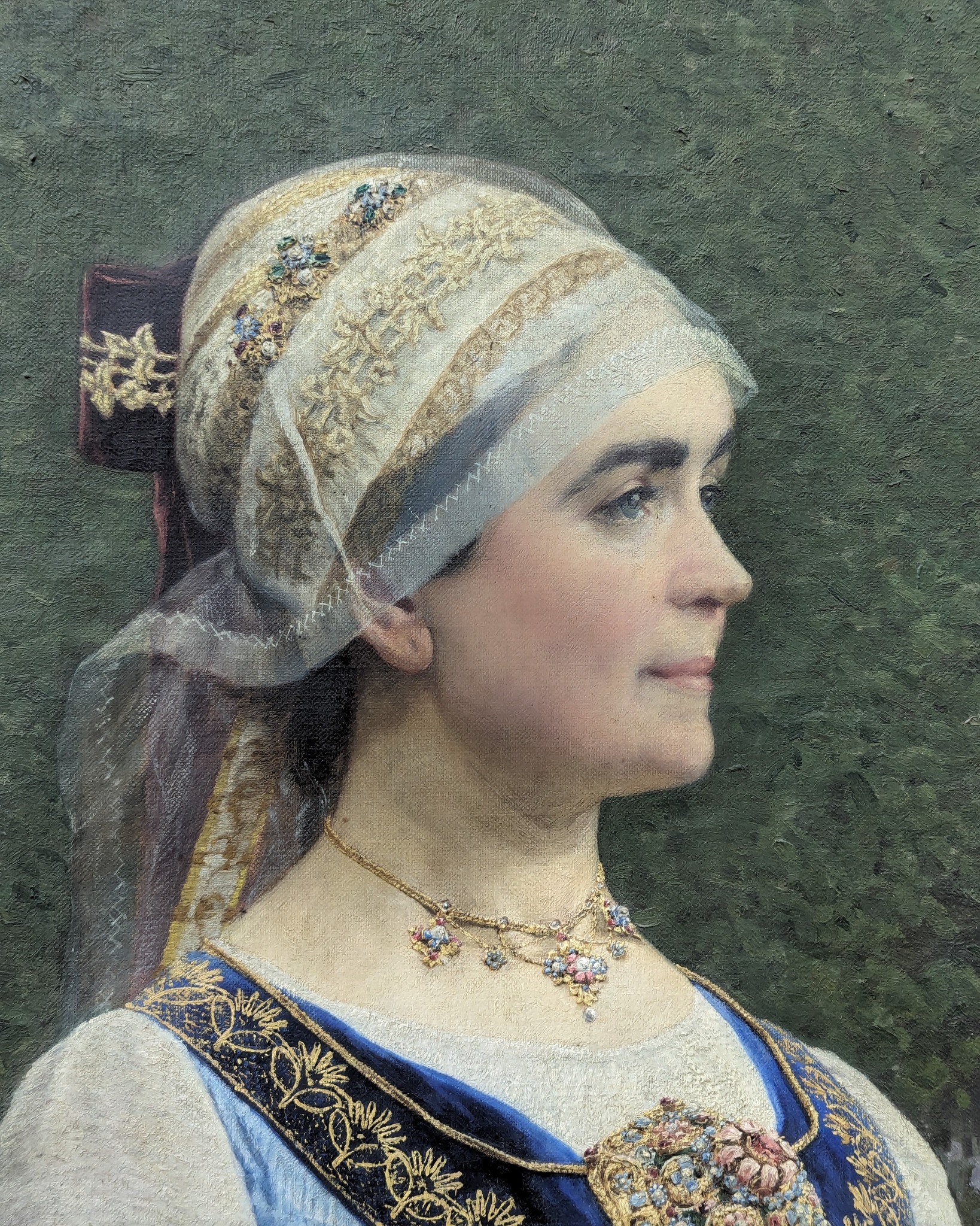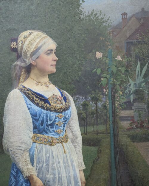 Odată cu trecerea timpului, vernisurile utilizate de pictori în vederea protejării suprafețelor pictate în ulei, se pot deteriora. Adesea, acestea pot dezvolta cracluri, se pot albi ori îngălbeni. În acest ultim caz, decolorarea opacizează detaliile originale ale picturii afectându-i întreaga tonalitate cromatică. Tonurile de alb și crem devin gălbui, în timp ce albastrurile virează în verde. Curățarea vernisului îngălbenit este un proces delicat, dar poate schimba în mod dramatic aspectul general al picturii. Opera de artă selectată a fost realizată de artistul brașovean Friedrich Miess, „în întâmpinarea anului jubiliar al lui Honterus 1898”, conform unei inscripții aflate pe spatele lucrării. Intitulată „Portret de femeie în port săsesc (Portretul Friedei Teutsch)”, Cu prilejul dezvelirii statuii lui Johannes Honterus pe 21 august 1898, Miess a realizat portretul mătușii sale, Frieda Teutsch, după o fotografie de Carl Muschalek, cumnatul ei. În cadrul festivităților de inaugurare a monumentului, membrele Uniunii libere a femeilor săsești au fost îmbrăcate în bogate costume naționale săsești. Lucrarea a fost realizată în ulei pe pânză și are dimensiunile de 198 x 115 cm – transmite Alexandra Ilnițchi-Ardelean, referent de specialitate Comunicare și PR.