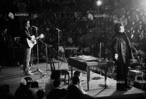 Adrian Păunescu (dr.) pe scena la Cenaclului Flacăra, Craiova, 9 martie 1982.