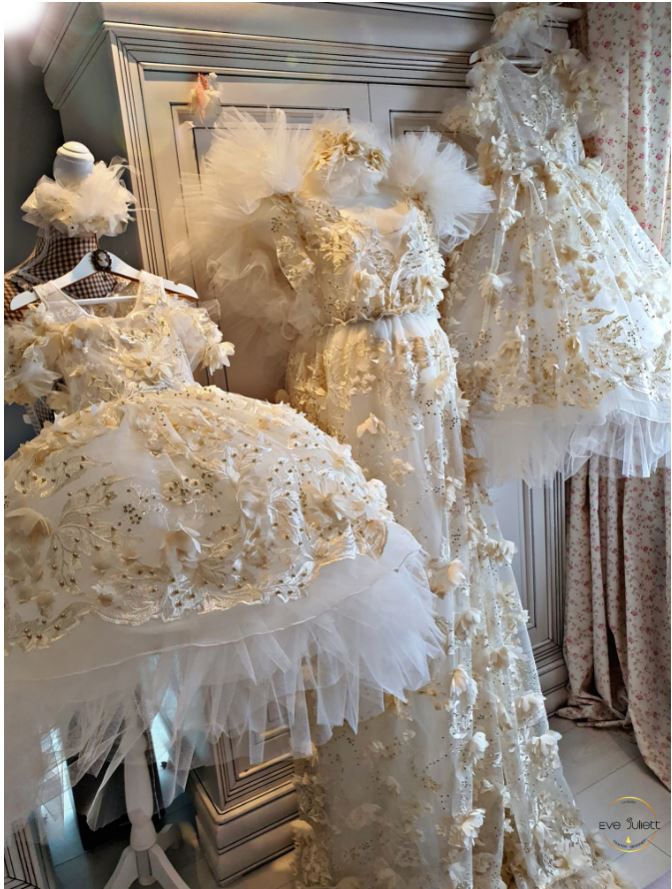 Vaporoase şi delicate, împodobite cu broderii 3D, fundiţe, perle, pene sau paiete şi obligatoriu asortate cu bentiţe decorate, rochiile făcute de ea aduc, într-o manieră stilizată, cu cele purtate în urmă cu mai bine de 150 de ani, când feminitatea şi eleganţa erau definite după alte criterii decât în ziua de azi.