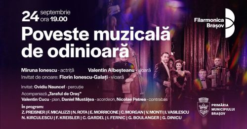 După cum ne-a informat secretarul PR al instituției, Iosif Trif, miercuri, 24 septembrie 2025, de la ora 19.00 în… Foaierul Sălii „Patria” este programat un Concert aparte intitulat „Poveste muzicală de odinioară”, ce propune reînvierea unor sonorități celebre din perioada interbelică. Eroii serii vor fi cunoscuta și apreciata actriță, interpretă vocală și prezentatoare TV, Miruna Ionescu, ce va performa alături de un virtuoz al arcușului, violonistul Valentin Albeșteanu. Cei doi împreună cu originalul „Taraf de Oraș” vor readuce în sufletul asistenței parfumul muzicii ușoare românești de altădată. Invitat de Onoare este reputatul violonist Florin Ionescu-Galați, căruia i se alătură un percuționist de marcă, Ovidiu Nauncef, șef de partidă în Orchestra Simfornică brașoveană.