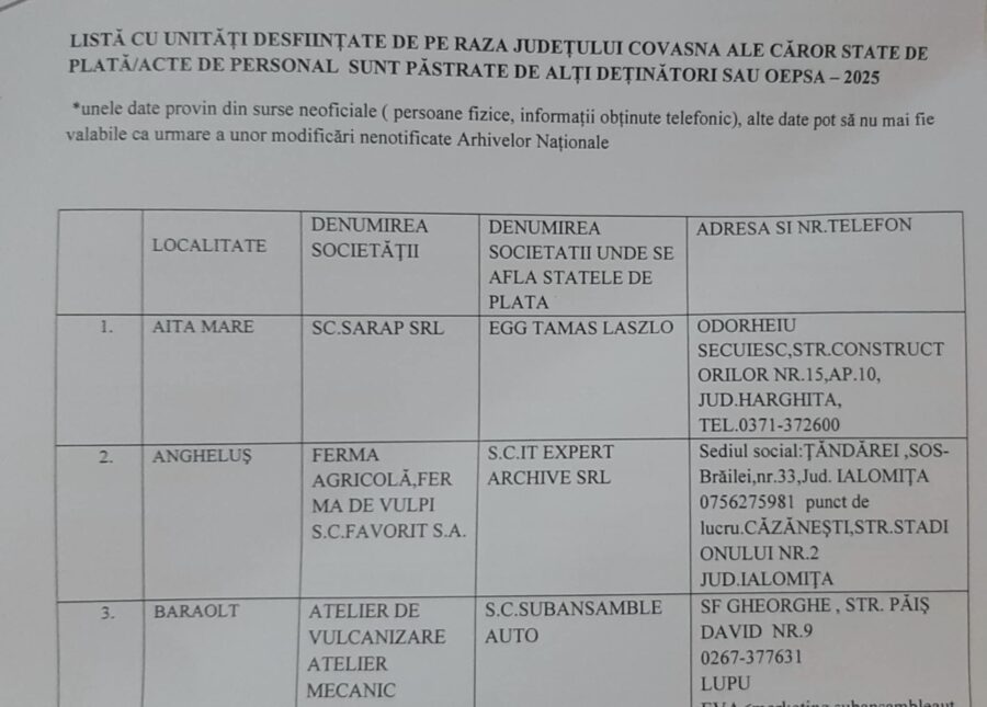 Raduly Istvan a menţionat că, în urma demersurilor făcute, Prefectura a obţinut o listă cu peste 150 de operatori economici care păstrează arhivele fostelor unităţi din Covasna, cu adrese şi numere de telefon, listă care va putea fi consultată pe site-ul instituţiei –https://cv.prefectura.mai.gov.ro/lista-cu-unitati-desfiintate-de-pe-raza-judetului-covasna-ale-caror-state-de-plata-acte-de-personal-sunt-pastrate-de-alti-detinatori-sau-oepsa-2025/