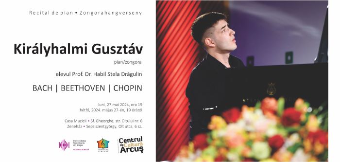 În organizarea Centrului de Cultură Arcuş (Casa Muzicii, str. Oltului nr. 6) și-a Universității Transilvania-Facultatea de Muzică, astăzi, 27 mai, la ora 19.00 are loc un recital extraordinar de pian susţinut de Királyhalmi Gusztáv, elev la Liceul Vocațional de Muzică „Tudor Ciortea” din Brașov, sub îndrumarea Prof. Dr. Halib Stela Drăgulin, cunoscută ca fiind profesoara care a format unii din cei mai buni pianiști români ai ultimilor decenii.