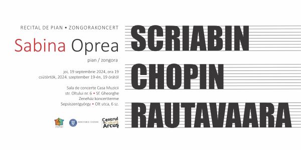 La Centrul de Cultură Arcuş din Sfântu Gheorghe (Casa Muzicii, str. Oltului nr. 6) are loc astăzi, 19 septembrie 2024, ora 19, un concert extraordinar de susţinut de pianista Sabina Oprea – asist. univ. dr. al Departamentului de Instrumente cu Claviatură și Ansambluri Instrumentale din cadrul Academiei de Muzică Gheorghe Dima – Cluj.