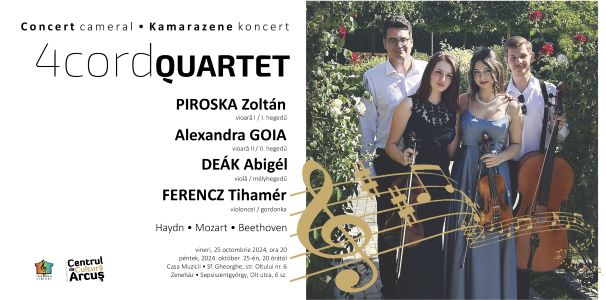 La Centrul de Cultură Arcuş (Casa Muzicii, str. Oltului nr. 6, Sfântu Gheorghe) va avea loc vineri, 25 octombrie a.c., ora 20.00, un recital extraordinar de muzică de cameră susținut de formația „4cord Quartet”.