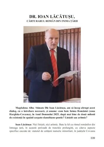 Interviul acordat de dr. Ioan Lăcătușu reprezintă o amplă și substanțială contribuție a volumului, articulând o viziune coerentă despre identitate, responsabilitate civică, cercetare istorică aplicată și slujire a comunității. Titlul dialogului – „Cărturarul român din inima țării” – nu este o simplă formulare metaforică, ci o realitate trăită zi de zi de autorul unei impresionante opere științifice și culturale desfășurate în județele Covasna și Harghita, un teritoriu cu semnificații aparte în contextul istoriei contemporane a României.