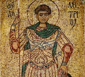 Ilustrul personaj cu acest nume a trăit în sec. XIII, fiind botezat în taină de părinţii săi, datorită prigoanei la care erau supuşi creştinii pe vremea împăraţilor Diocleţian şi Maximian Galeriu. Tatăl său, conducătorul Cetăţii Tesalonicului, l-a educat de mic să respecte valorile creştinismului, fiind iniţiat pe ascuns în tainele sfintei credinţe, întru dragostea faţă de semeni şi compasiune pentru sărmani. După moartea părintelui său, tânărul Dimitrie a ajuns la rându-i un om de vază, un erudit. Ca atare, împăratul Maximian l-a numit voievod în locul tatălui său, Dimitrie ajungând să fie iubit şi respectat de norod. Numai că propovăduind fără să se ferească dreapta credinţă întru Iisus, a stârnit mânia puternicilor vremii. Atunci când a trebuit să aducă jertfă zeilor – după cum făceau păgânii vremii – el a refuzat! Ba mai mult, şi-a mărturisit credinţa în Mântuitor. Ca atare a fost întemniţat şi ameninţat cu moartea. Însă, tot nu a renunţat. Fiindcă nu s-a lepădat de convingerile creştine, sfârşitul a venit repede, fiind ucis alături de alţi creştini.