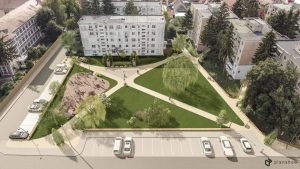 Busturile lui Gábor Áron și Nicolae Bălcescu au fost mutate în interiorul spațiului comunitar, ceea ce va permite locuitorilor să folosească mai bine spațiul deschis. Ținând cont de traseul folosit în prezent de locuitori, spațiul comunitar va fi traversat de două alei diagonale, a căror amenajare este în curs de desfășurare. Constructorul a pregătit aleile cu piatră spartă și au fost montate căminele pentru rețeaua de apă pluvială. Restul suprafeței, cu excepția terenului de joacă, va fi acoperit cu gazon și vor fi create 15 noi locuri de parcare.