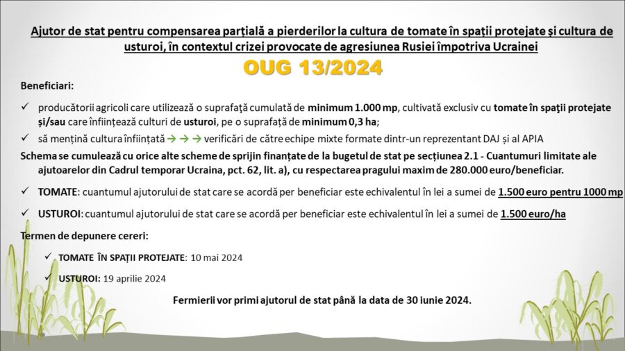 Întreprinderile care îşi desfăşoară activitatea în domeniul producţiei primare de produse agricole vegetale pot beneficia de schema de ajutor de stat pentru compensarea parțială a pierderilor la cultura de tomate în spații protejate și cultura de usturoi, în contextul crizei provocate de agresiunea Rusiei împotriva Ucrainei. Depunerea cererilor se va face până la data de 10 mai 2024, inclusiv, la cultura de tomate în spații protejate și până la data de 19 aprilie 2024, inclusiv, la cultura de usturoi.
