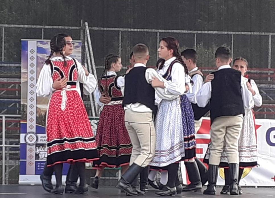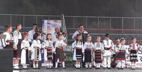 Deocamdată au doar o învârtită în repertoriu; în rest programul este compus din cântece cântate în grupuri de trei sau cinci, ori solişti individuali. Dar cu copiii mici, nici nu prea poţi să faci suitele vechi. Important este că se mişcă împreună şi cântă iar pe parcurs vor învăţa ei şi jocurile. Cel mai micuţ are 3 ani(nu ştiu dacă i-a împlinit), şi-l cheamă Simion. Au câteva fetiţe care cântă foarte bine între cele 14 soliste care au cântat la noi pe scenă. Oricum, e o mare încântare să vezi o trupă de ,,gândăcei” îmbrăcaţi în strai naţional mişcându-se după ritmul impus de taraf.
