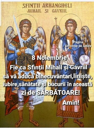În dată 8 noiembrie credincioșii îi cinstesc pe Sfinții Arhangheli Mihail şi Gavriil, consideraţi conducătorii cetelor de îngeri şi călăuze ale sufletelor muritorilor în drumul spre Rai. Din vechime se crede că ei vestesc tainele lui Dumnezeu şi îi protejează pe oameni de rele, veghiind în permanenţă la bine acestora.