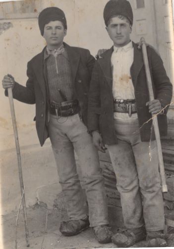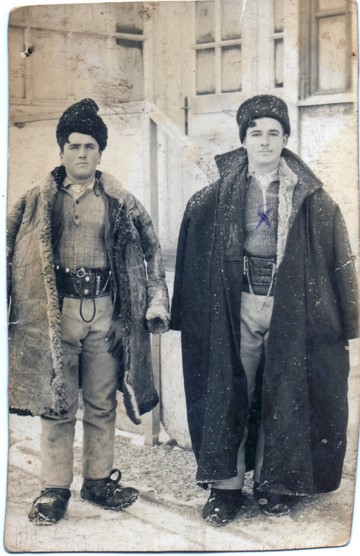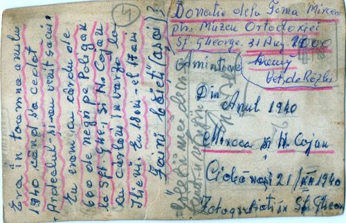 Fotografia este din 1940. „Era în toamna anului 1940 când s-a cedat Ardealul și au venit săcuii. Eu eram cu cârdul de 600 de negri pe Poligon la Sfântu Gheorghe și Nea Cojan cu cârlanii la Ilieni. Eu 18 ani-el 17.ani. „Faini băieți! Așa-i?” scrie pe spatele fotografiei.